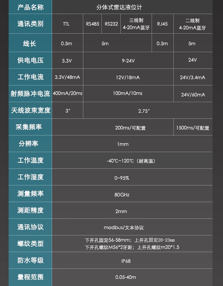 80G雷達(dá)物位計(jì),支持RS485/RS-232/RJ45/4-20MA/應(yīng)用。產(chǎn)品最大量程可以達(dá)到40米,盲區(qū)最小可以達(dá)5cm。由于它工作頻率更高,波長(zhǎng)更短,尤其適合固體應(yīng)用;通過(guò)透鏡發(fā)射接收電磁波的工作方式,在高粉塵、惡劣溫度環(huán)境下(+75℃)具有獨(dú)特的優(yōu)勢(shì);儀表通過(guò)螺紋的固定方式,使得安轉(zhuǎn)便捷簡(jiǎn)易。